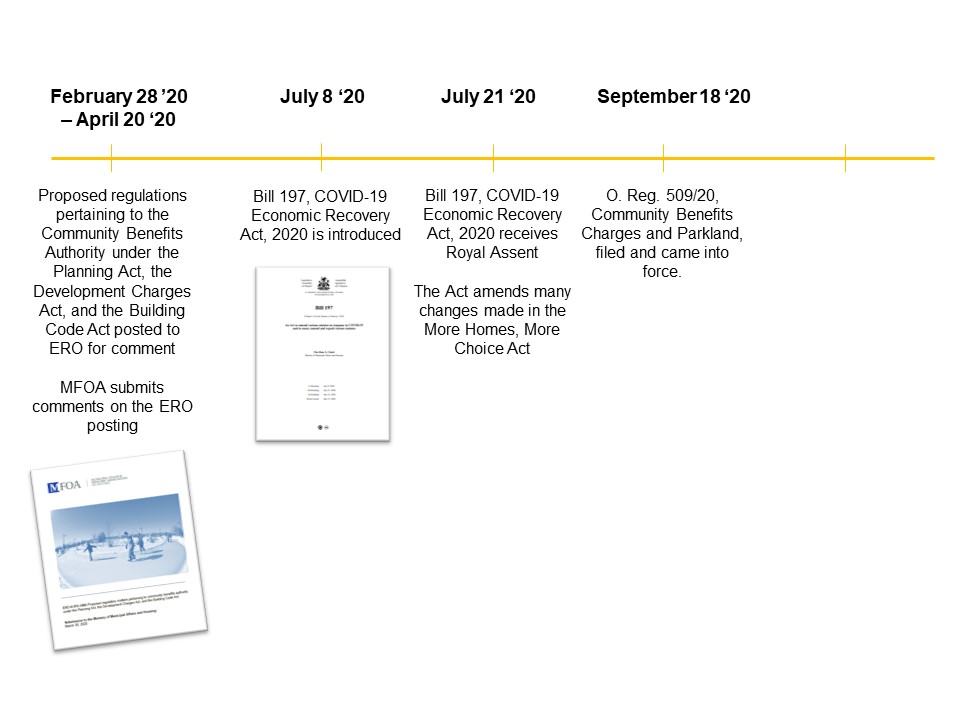 On June 6, 2019, Bill 108, More Homes, More Choice Act, 2019 received Royal Assent. The Act contains changes to the Development Charges Act as well as the Planning Act, including the introduction of the new community benefits charge. Further changes to the Development Charges Act and Planning Act were made through Bill 138, Plan to Build Ontario Together Act, 2019 and Bill 197, COVID-19 Economic Recovery Act, 2020. Similarly, on September 18, 2020, O. Reg. 509/20: Community Benefits Charges and Parkland came into force.